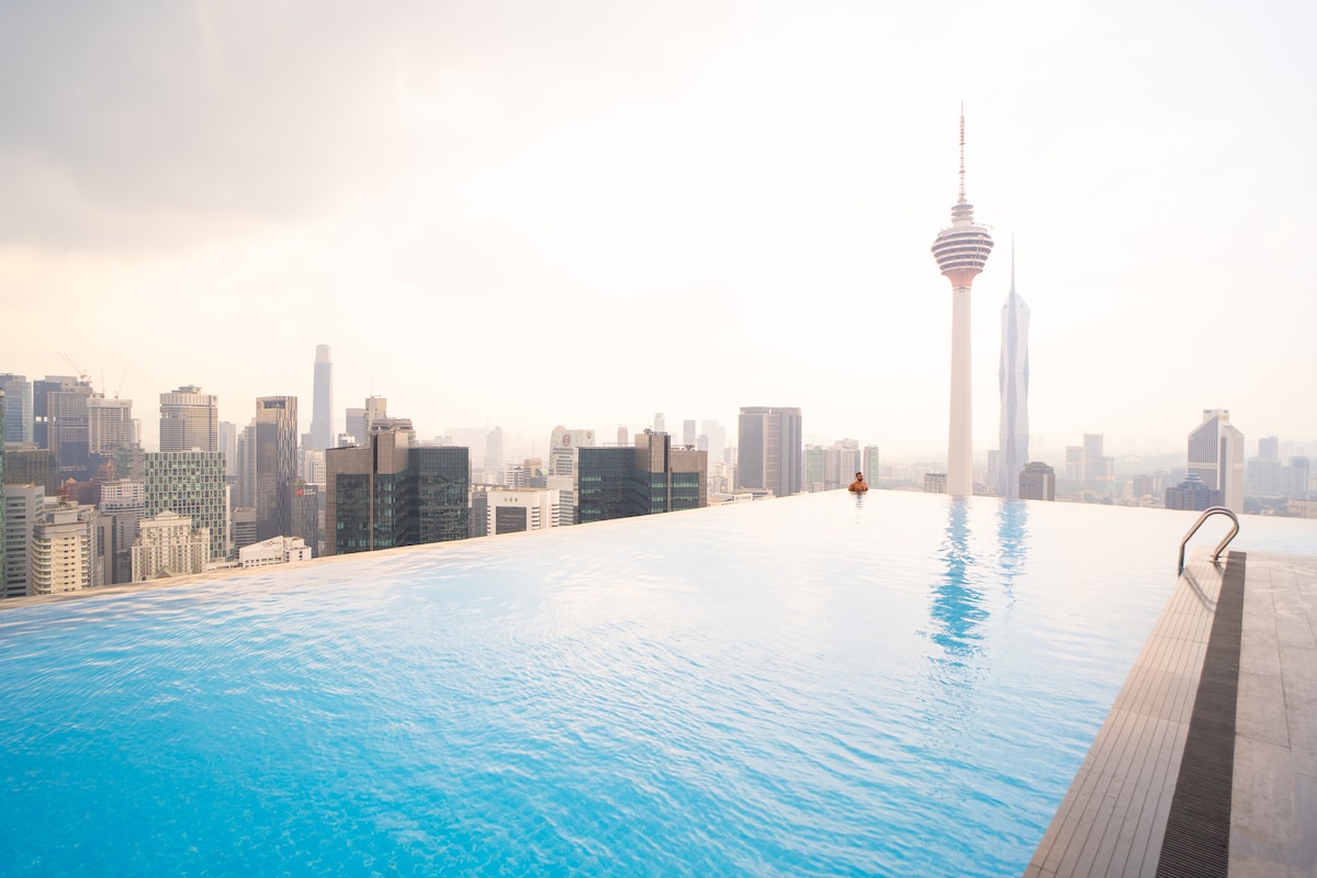 豪华2卧室房源,可供4人入住,配备天际泳池,可欣赏吉隆坡城中城双子塔180度景观