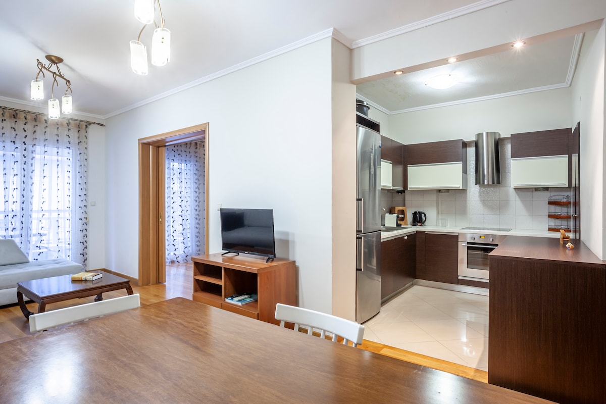 Stylish, sunny apartment 2km from downtown and 200 meters away from a metro stop. One bedrooms with double bed, a living room with fully equipped kitchen, comfortable sofa that can be turned into a bed, one bathroom ,a balcony with a great view and private parking space. The apartment is fully equipped to accommodate short and long stays