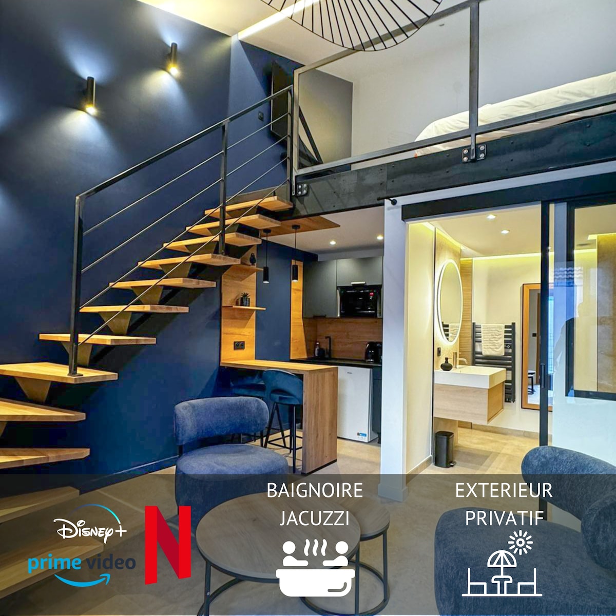 带按摩浴缸的Loft,按摩和灵气放松。