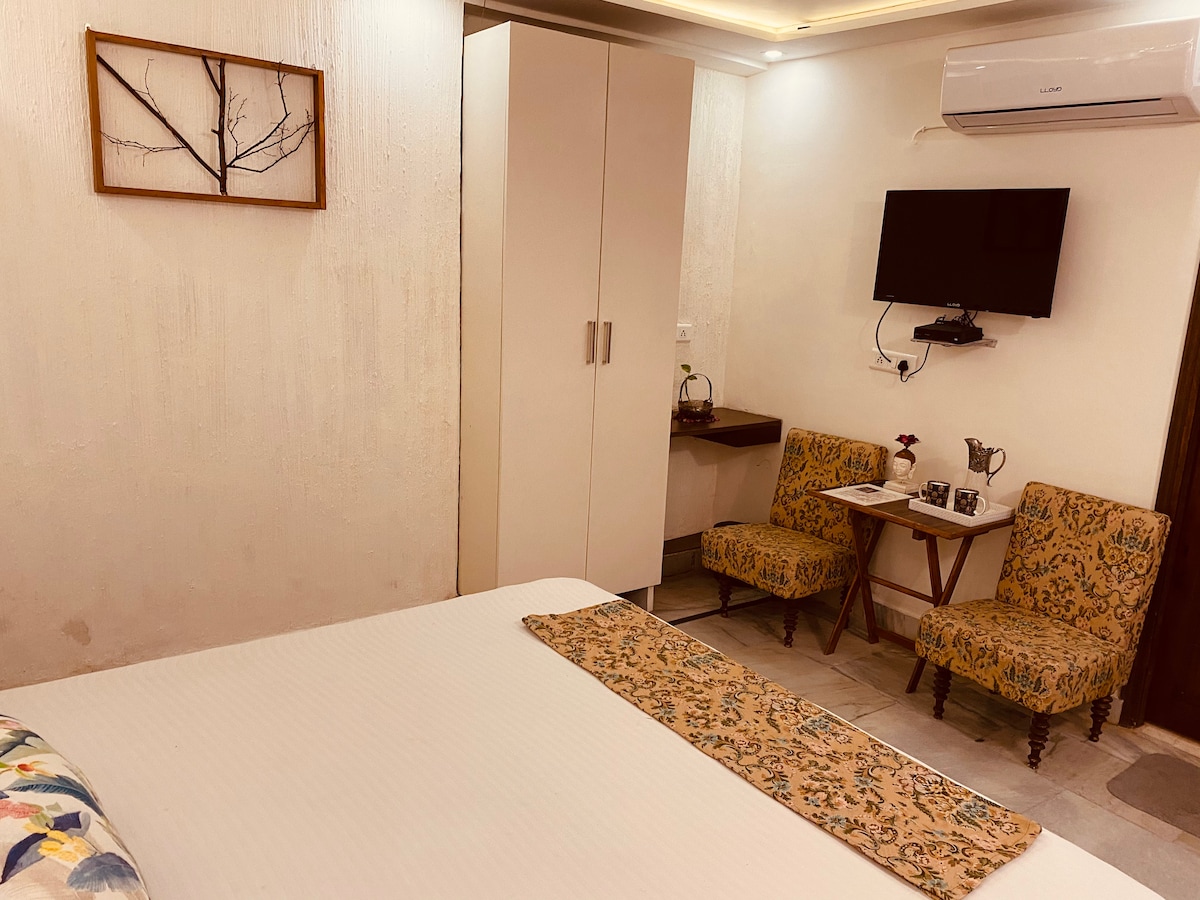 My red brick haveli shall be your home when you stay with us. It is surrounded by greenery and fruit trees and my dog running around will be framed in your mind upon your stay. A peaceful, green, homely atmosphere with soft chanting music in the background, fresh food, your 'Me Time' awaits you. 10 mins from all sightseeing and eating places. Open terrace, central courtyard and fresh air in the heart of the city awaits you.
