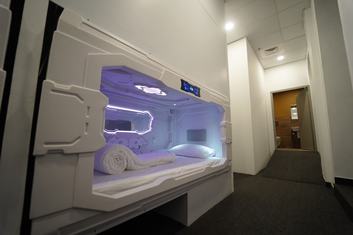 2 bedded room Ideal for couples, friends or families who value comfort and privacy. ★ 12 cozy personal POD Rooms ★ Include Complimentary Central AC, WIFI, lounge, disposable Towel, welcome kit, Carpeted Interiors, Iron, Microwave, kettle, hair dryer, games ★ Hourly, Nightly stay, Flexi Checkin On the 1st floor of town hall building on heritage street, 7 mins walk from Golden Temple, next to multilevel parking, above famous partition museum with eateries and kids game zone in same building.