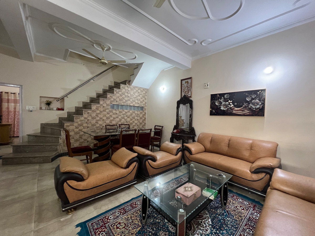 This home provides a serene and peaceful setting on ground floor , conveniently situated near all tourist spots & amenities. GOLDEN TEMPLE within 10-12mins✔️ Ground floor+Private lawn✔️ 3BHK with full bathrooms✔️ Full kitchen/laundry/living room/porch✔️ Free indoor car parking✔️ AC/Wifi/TVs/fridge✔️ Close to restaurants/cafes✔️ Breakfast options✔️ Airport 8km(13min) Railway station 3.9km(8min) Sada pind Amritsar 5km(7min) Fort Gobindgarh 5.6km(15min) Wagah border 29km(30min) PLEASE READ BELOW: