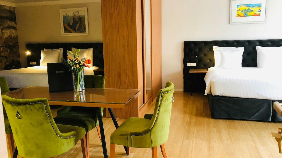 Step into the grand deluxe room where an impressively spacious layout welcomes families or small groups with two queen size beds and a comfy bed sofa for the fifth guest enjoy the convenience of a kitchen and dining table perfect for sharing snacks or meals after a day exploring the city unwind with a relaxing rainfall shower or a warm bath and make the most of a homey retreat designed for togetherness and comfort.
