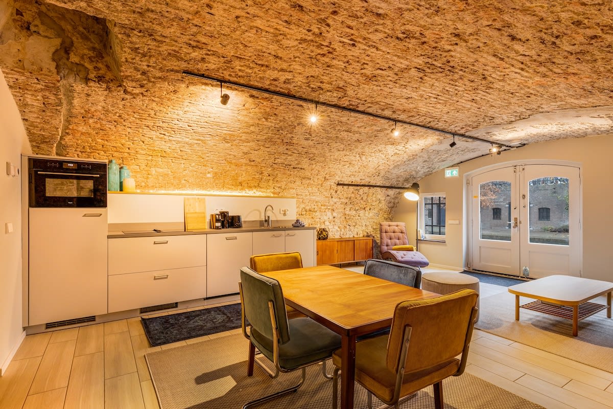 The centrally located Smithy is a wonderful place to hang out with your friends, family, and colleagues all year round. During the winter, have a drink by the fireplace in the spacious living room. During the summer, enjoy a BBQ in the sun-drenched garden, looking over the water. Cook together in the bright kitchen, and enjoy a delicious meal at the dinner table. The location of the historic barracks, The Ripperda, is not only beautiful but also wonderfully central.