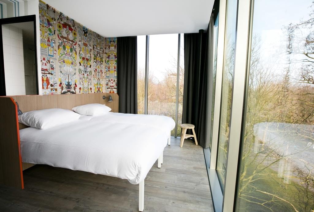 Located in the center of The Hague, our recently renovated rooms are luxurious and comfortable. This room is for four people, with a double bed, a bunk bed and an en-suite bathroom. It is fresh and relaxing with a calming forest theme.