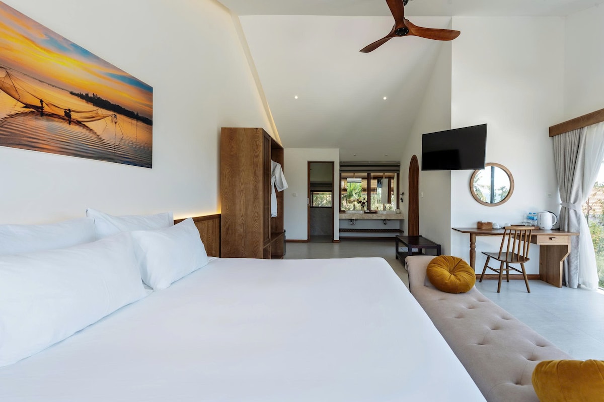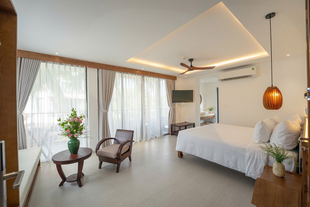 🎁 A newly built villa just 3 minutes’ walk to both Cua Dai Beach and Thu Bon River, offering a rare blend of privacy, wellness, and coastal charm. Enjoy a private pool, beach yoga, and walkable access to local restaurants and spas. With 3 serene bedrooms (2 king beds + 2 singles), it comfortably hosts 6 adults + 2 kids (under 6) — perfect for families seeking space, relaxation, and meaningful connection in a refined, tranquil setting.