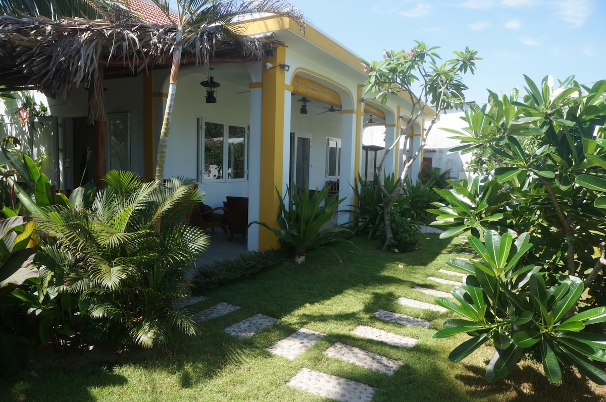 Located at the heart of An Bang Beach, Hoi An. 1min walk to the white sandy beach, 10 minute cycling to ancient town. The bungalow has two private bedrooms with private ensuite baths. 2 rooms connected to each other by a locked door. Each room has own entrance w garden, daybeds on patio to enjoy our oasis green garden & sea breeze. Kingsize bed with comfy mattress, AC, smart TV, free strong wifi, mini fridge. Nearby bars and restaurant with live music until night, convenient for robust fun trip