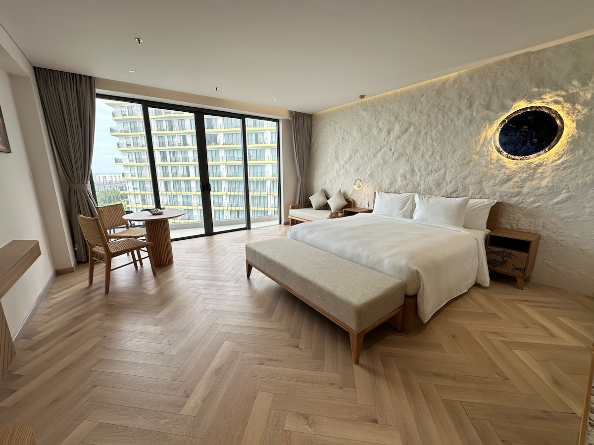 The studio has 1 king bed or twin beds (upon your request) with sea view. You might receive my room (the one on the listing) or another studio room. The room is 35 sqm. There are 3 swimming pools, private beach, restaurants, spa, kids' area, etc. You have access to the pools but you cannot use the gym. If you want to use the towels at the pools, you have to pay an extra of 80,000 vnd. If you want to use the sunbeds at the beach, you might have to buy something (a drink/a dish,...) there.
