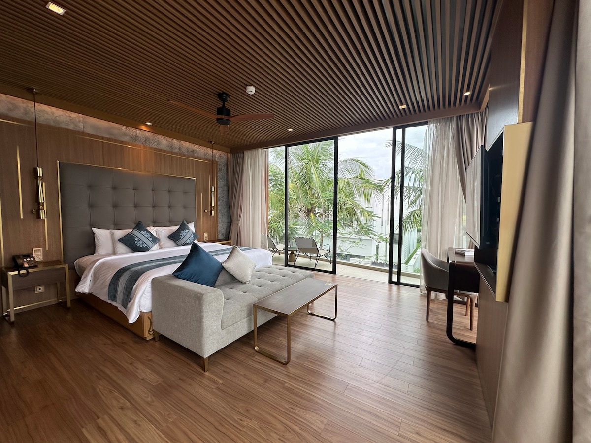 The studio has 1 king bed or twin beds (upon your request) with sea view. You might receive my room (the one on the listing) or another studio room. The room is 35 sqm. There are 3 swimming pools, private beach, restaurants, spa, kids' area, etc. You have access to the pools but you cannot use the gym. If you want to use the towels at the pools, you have to pay an extra of 80,000 vnd. If you want to use the sunbeds at the beach, you might have to buy something (a drink/a dish,...) there.