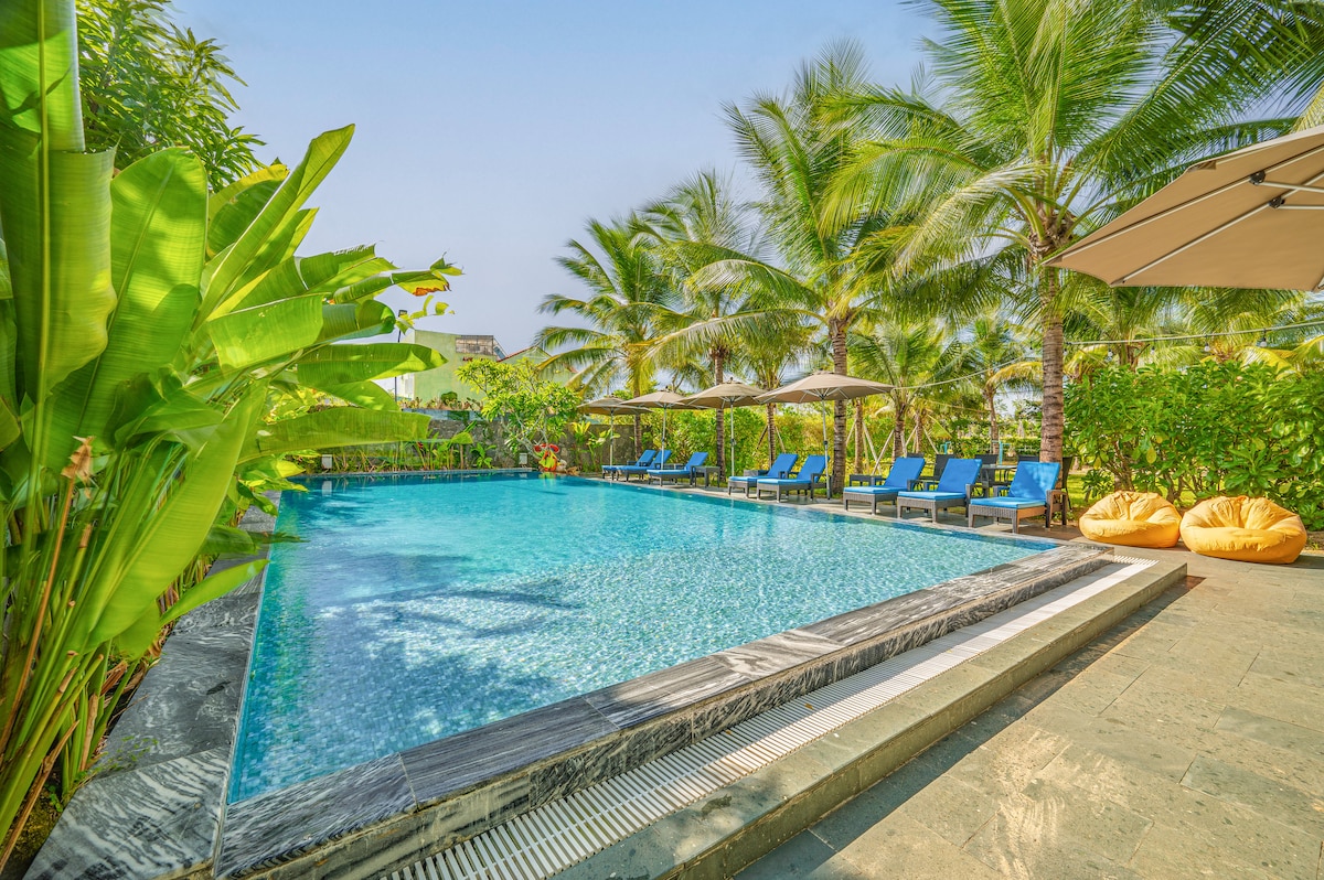 Experience a stylish and peaceful stay in this 55m² penthouse, featuring a private outdoor bathtub where you can unwind under the sky or enjoy a romantic sunset soak. The room includes a king-size bed (1.8m x 2m), a private balcony, and a fully equipped kitchen – perfect for couples seeking comfort, privacy, and a little extra charm during their stay. Guests enjoy free bicycles and access to the swimming pool, just 2 km from Hoi An Ancient Town, An Bang Beach, and the scenic rice field
