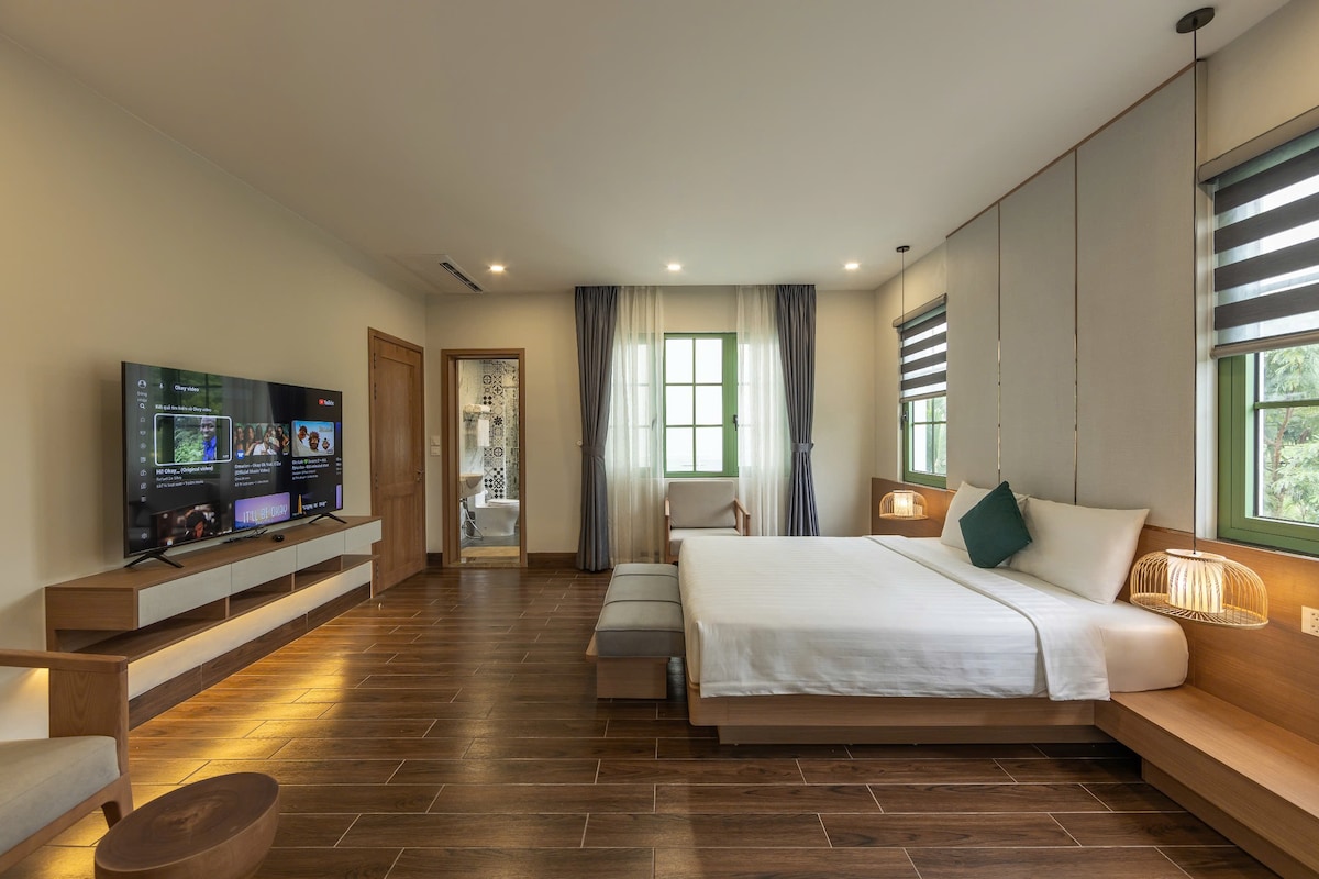 Tận hưởng kỳ nghỉ sang trọng tại Villa của chúng tôi, nơi sự riêng tư và tiện nghi gặp gỡ. Phòng có giường lớn êm ái, bồn tắm thư giãn, điều hòa mát lạnh và đặc biệt là tầm nhìn trực diện ra hồ bơi xanh mát. Một không gian hoàn hảo để bạn thư thái và nạp lại năng lượng.