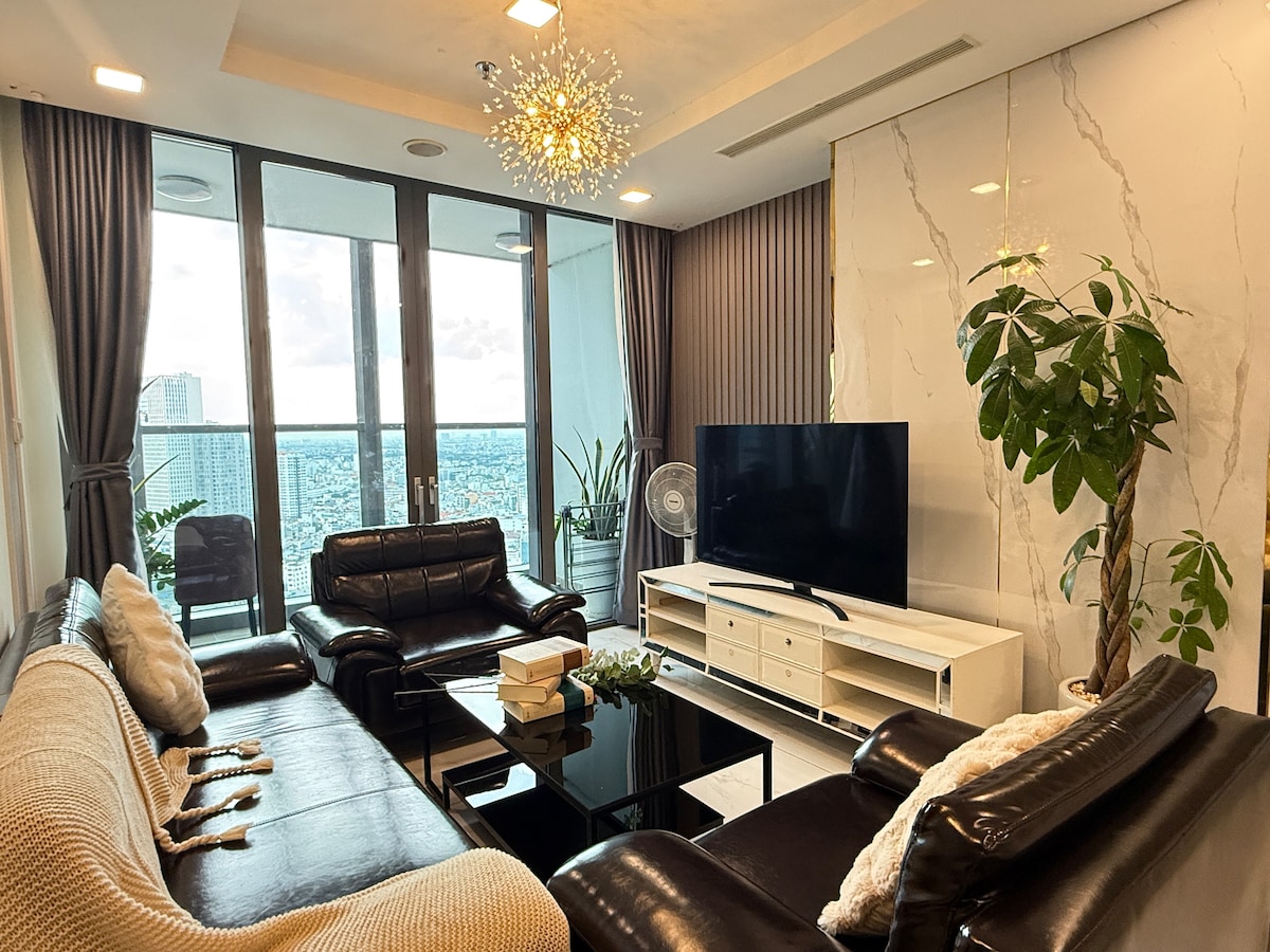 Đây là căn hộ có 4 phòng ngủ tại tòa nhà "Landmark 81" - tòa nhà cao nhất Việt Nam. Bên dưới là một Shopping Mall cỡ lớn với đầy đủ dịch vụ ăn uống, giải trí, mua sắm, rạp chiếu phim, dịch vụ quan sát thành phố từ tầng 81, nhà hàng fine-dining. Căn hộ có nội thất cao cấp và thiết kế riêng, trang bị bồn tắm nằm, máy giặt sấy, thích hợp cho mọi kỳ lưu trú từ ngắn đến dài hạn. Có tổng cộng 2 ban công lớn ở phòng ngủ và phòng khách, một phòng ngủ khác có tầm nhìn tràn kính về thành phố.