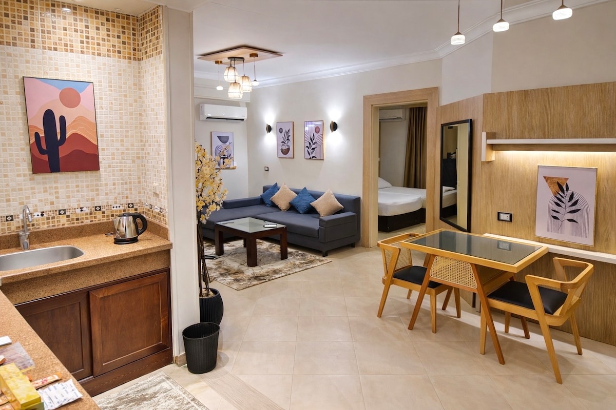 استمتع بإقامة فاخرة في شقة مكونة من غرفتين نوم بتشطيب فندقي، داخل واحدة من أفضل المواقع بمدينة نصر، بجوار مول سيتي ستارز مباشرة. الشقة مفروشة بأثاث أنيق وعصري، وتضم: مطبخ مجهز بالكامل بكل ما تحتاجه (ثلاجة، ميكروويف، غلاية، اير فراير). مكواة وطاولة كوي لتكون إقامتك مريحة وكاملة. صالة واسعة ومضيئة للراحة والاسترخاء. إنترنت فائق السرعة وتكييف مركزي الموقع مميز جدًا، على بعد خطوات من المطاعم، الكافيهات، المولات، وسهل الوصول إلى المطار مثالية للعائلات أو رجال الأعمال الباحثين عن الراحة والفخامة
