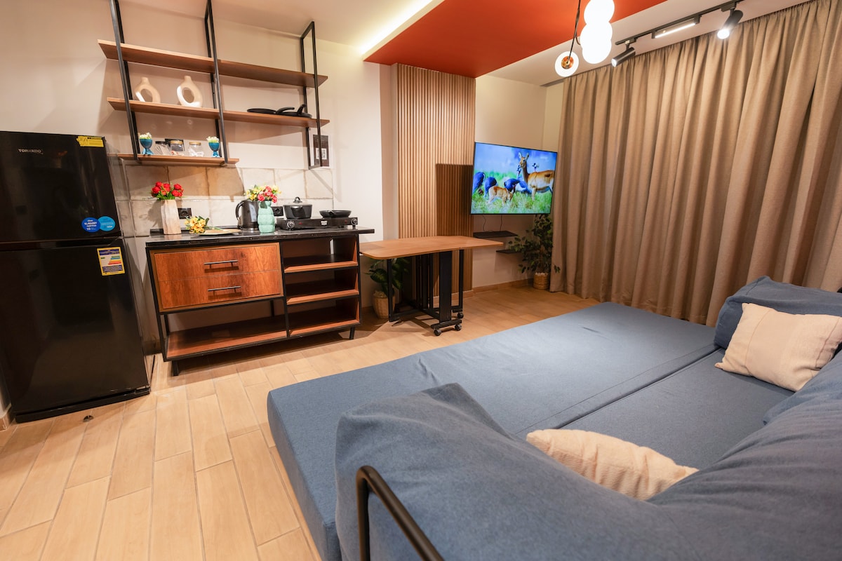 A ground floor studio in El Asher Nasr City. Perfect for solo travelers or couples. A Tiny yet comfortable space offering the necessities while being 20 minutes away from the Airport, 15 away from Cairo festival City mall, Downtown mall and City Stars mall. Please note that while the entrance is private, the studio’s proximity to the street means that you might hear some noises occasionally. Check the bathroom photos VERY carefully to ensure it meets your expectations, as it’s quite small.