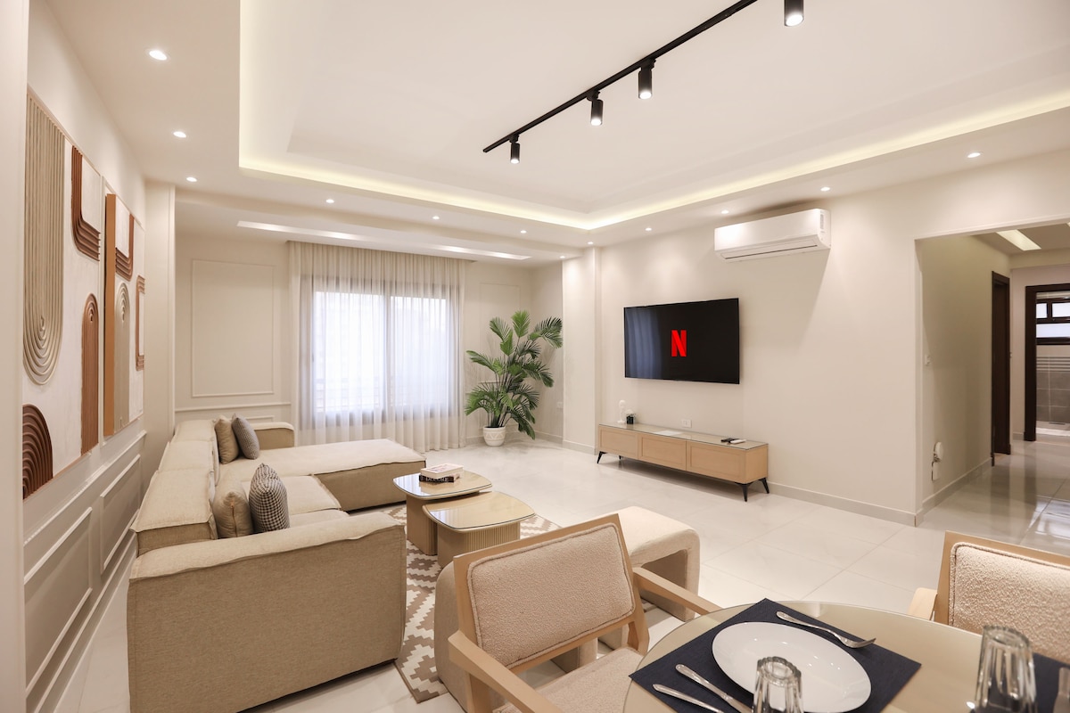 Experience modern boho luxury in this brand-new (Oct 2025) apartment located in the prestigious West Golf Extension, New Cairo — just minutes from 5A Walkway, Cairo Festival Mall, and Katameya’s vibrant spots. Enjoy presidential master bedroom, 4 Smart TVs, concealed A/C, electric shutters, and all-new appliances in a bright, elegant space. Perfect for guests seeking comfort, style, and an upscale Cairo experience.