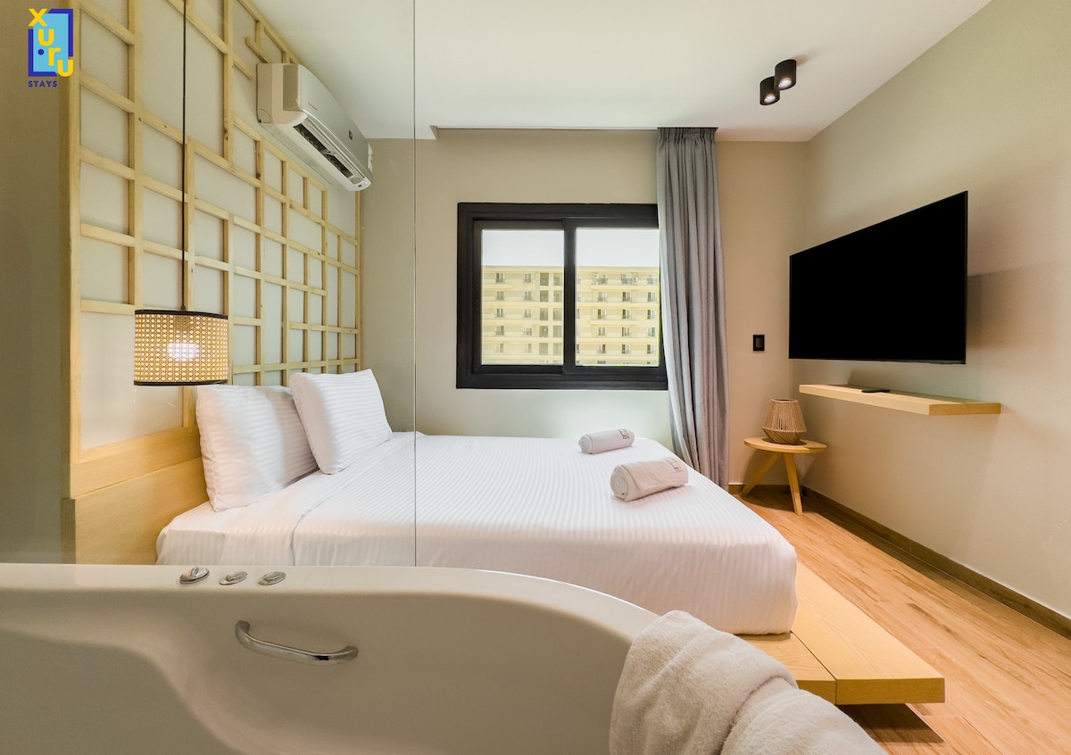 1卧室中转休息室,带按摩浴缸,距离机场5分钟