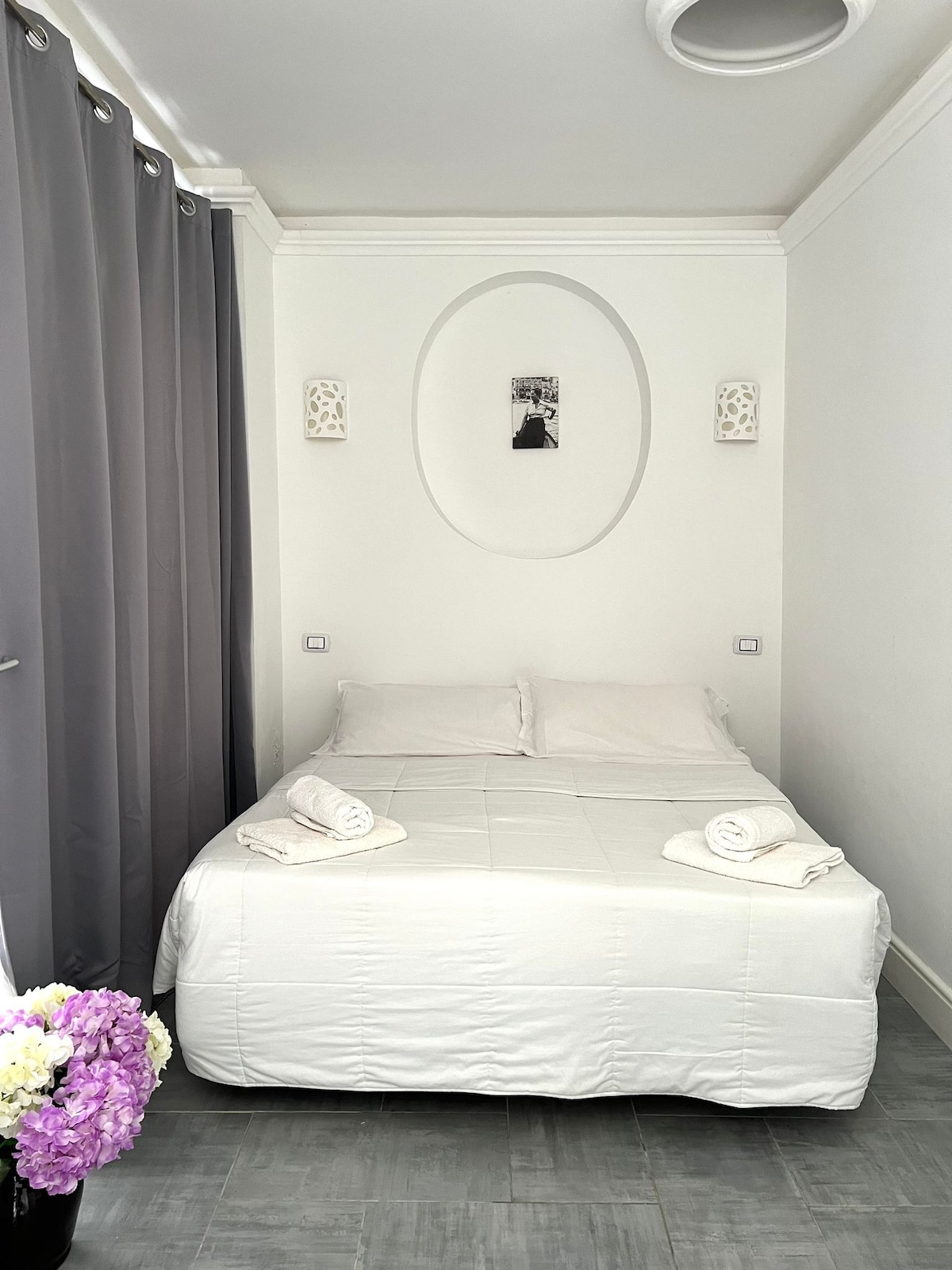 La suite è composta da due eleganti zone notte, una con letto matrimoniale e l’altra con due letti singoli, rese indipendenti da una porta scorrevole che garantisce privacy e comfort. Gli ambienti si aprono su due balconcini affacciati sul pittoresco centro storico. Completano la dotazione aria condizionata, Wi-Fi veloce, due Smart TV, mini-frigo e un bagno elegante con box doccia e servizi.