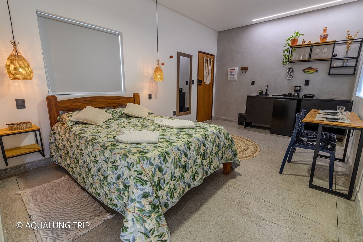 Este lugar único te proporciona a melhor hospedagem da cidade . Um apartamento decorado de forma única , contando com dois quartos , sendo um deles com ar-condicionado e o outro com ventilador. Ambos com cama queen e acolchoados irresistíveis. Cozinha completa com mesa posta e todos os utensílios , sala de estar muito aconchegante . Acomoda até 4 pessoas . Venha ter a melhor experiência de conforto em Arapiraca !
