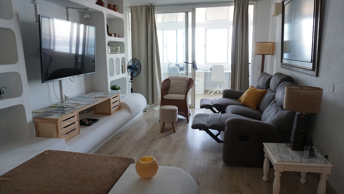Bienvenido a nuestro elegante apartamento, ubicado en el corazón de Los Cristianos. Este exclusivo alojamiento combina un diseño moderno con una decoración elegante, creando el espacio perfecto para una estancia cómoda. El apartamento esta completamente amueblado con muebles nuevos de alta calidad que destacan su estilo refinado. La amplia sala de estar, con grandes ventanales, llena las habitaciones de luz natural y ofrece una impresionante vista panorámica de la playa y el océano.