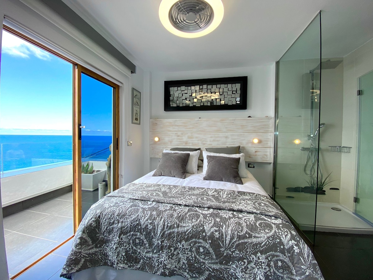 “Bella-Vista Suite" bien merece su nombre: ubicado en la ladera de un impresionante acantilado, tendrá la sensación de estar flotando sobre el océano a 220 metros de altura. Sin duda, podrá disfrutar de las mejores vistas infinitas de la costa norte de Tenerife, que arrancan con el majestuoso Océano Atlántico bajo sus pies, en la cala natural que alberga al complejo, y se extienden hacia el horizonte, culminando en el magnífico Teide sobre el valle.