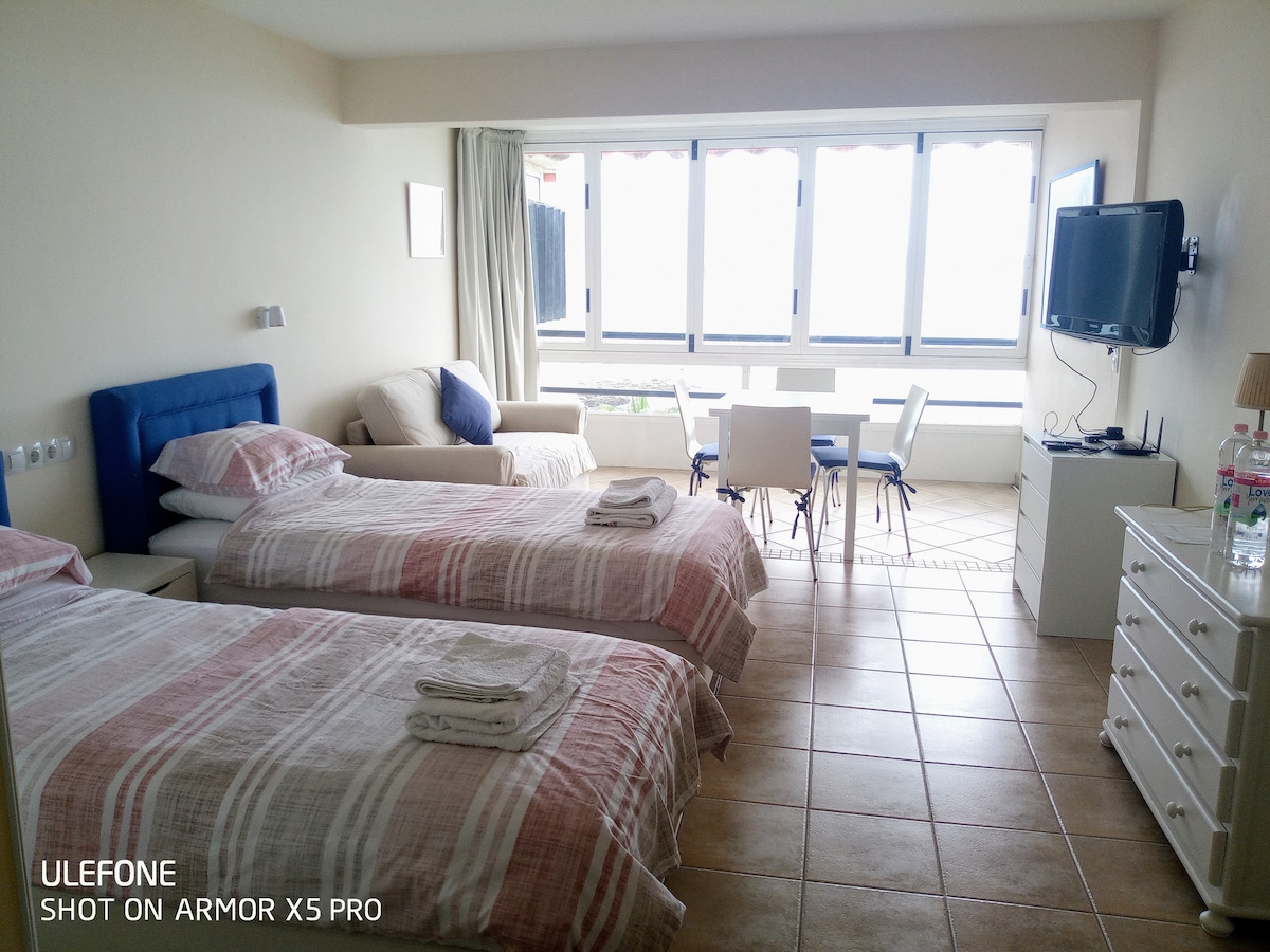 Welcome to our fully refurbished studio with an impressive ocean view, close to beautiful beaches and surf spots. Equipped with fast Wifi, smart TV, fully supplied kitchen, wonderful shower, washing machine and all comforts. Guests have free access to the swimming pool. The bus and taxi station is right in front of the studio. There are supermarkets and shops in front of the studio. Just 5 minutes walk from Playa de las Américas, 8 from Playa de Troya. 15km from the airport.