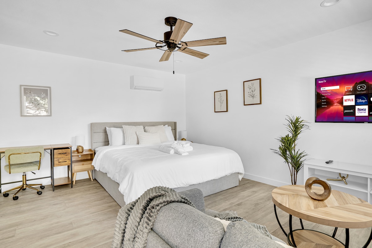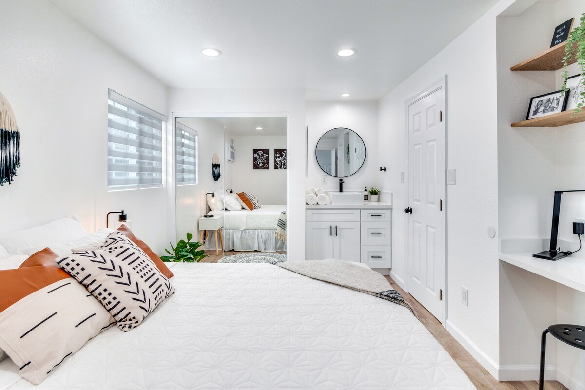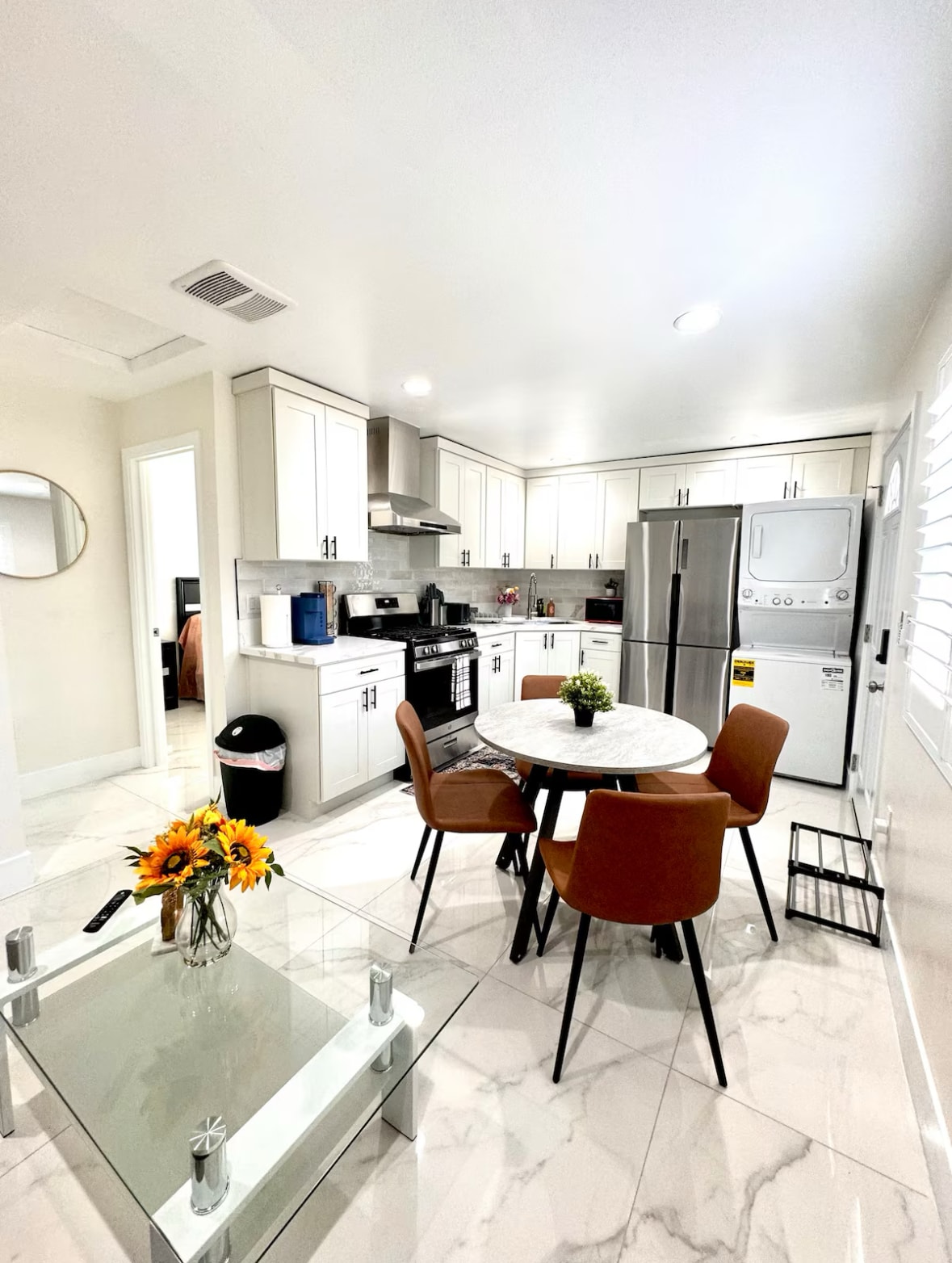 Welcome to your home away from home! Relax in this spacious guesthouse after an exciting adventure in Southern California. Optimized for comfort and privacy, this home boasts modern amenities and comfortable bedrooms. The master bedroom consists of a queen-sized bed, a spacious closet, and a stylish ensuite bathroom. The second bedroom features two twin-sized beds, great for children and individuals. There is also a fully equipped kitchenette, a cozy living room, and a private backyard.