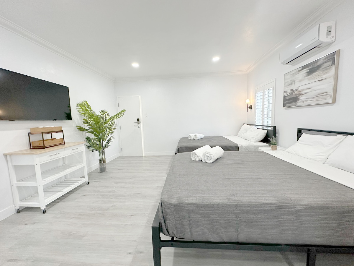 We offer newly renovated, modern rooms designed with the perfect blend of comfort and convenience at our boutique motel. This stylish place is central to must-see destinations like the SoFi Stadium, Disneyland and Universal Studios. Free: Wi-Fi, Cable TV, Parking, Micro Fridge, Microwave, Coffee Machine, All-Inclusive Utilities, Friendly and Professional Front Desk Staff, 24/7 Security. This room has a king size bed that comfortably sleeps 2 adults and 1 child. No deposit. 24/7 check in.