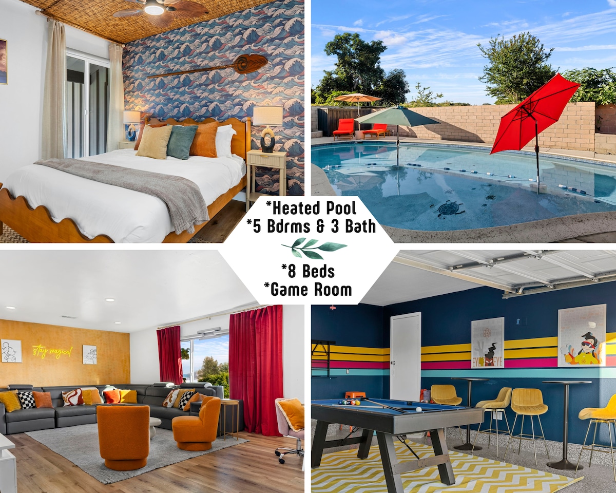Art-filled retreat with unique artifacts, a lush garden with vibrant plants and vegetation, small pond, private pool & spa, firepit, and outdoor kitchen. Relax in a quiet cul-de-sac with two shaded patios, modern entertainment including streaming TVs, surround sound, a small pool table, and an Xbox. Ideal for families, friends, couples, or business travelers seeking comfort, privacy, and a memorable Southern California stay near Disneyland and major attractions.