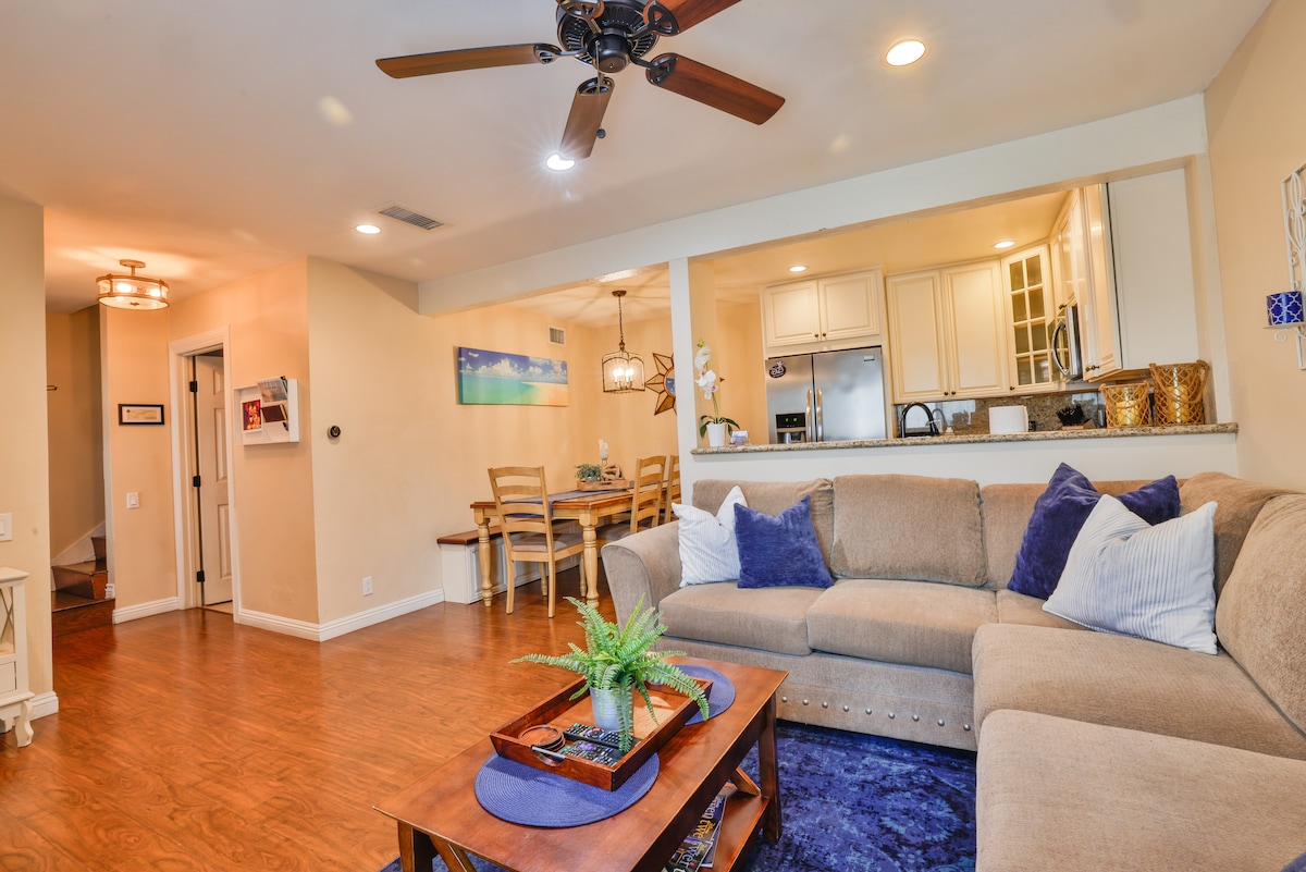 Unwind with a well-deserved cocktail on the terrace after a day exploring the nearby famous theme park. Stretch out on a couch in front of a TV and gas fireplace. Pop down to the pool for a refreshing dip. Tuck the kids into comfy bunk beds at night. 3 Night Minimum Stay. This Disneyland condo is situated less than 10 minutes’ walk from the entrance to the Disneyland Resort, with the delightful shops and restaurants of Downtown Disney in between. Walk to the free Disney tram that drops you off at the Disneyland and California Adventure entrances. Also, the Downtown Disney Monorail Station offers convenient transportation directly into the Tomorrowland area of Disneyland Park bypassing long lines at the main gates. This Disneyland rental home is 100% brand new inside! Completely remodeled Summer 2013, it has new hardwood floors throughout, fresh paint, new kitchen cabinets, new granite counter tops, new Frigidaire stainless steel appliances, new bathrooms, and all brand new furniture. Stocked with everything that will make your stay comfortable and easy, we have gone above and beyond, sparing no expense, to make your stay outstanding while offering the best value for your money. Bedrooms and Sleeping Accommodations The master bedroom suite features a California King size bed, walk in closet and a 50 inch LED Smart TV. The second bedroom boasts a Twin over Full bunk bed with Trundle pullout (sleeps 1 above, 2 below and 1 on pullout), and a 40 inch LED Smart TV with DVD player. The living room features a large sectional and 50 inch LED Smart TV. The condo also has a full sized roll-away bed with bedding and an air mattress. Complex Amenities While you’re here at the best of Disneyland rental homes, be sure to enjoy the swimming pools and hot tub. Relax, refresh and rejuvenate at our 3 resort-style pools, an 80' lap pool, a large recreation pool, and a kid pool. Soak in the hot tub after a long day at the parks. Two large playgrounds provide a safe way for kids to spend any extra energy. Depending on the season, on certain nights you can even create a special memory for your family by walking to the grassy park for a prime view of the Disneyland fireworks display! Unit Amenities: · Bath towels, hand towels, wash cloths and bath mats · Pool towels · Bath soap, Shampoo & Conditioner · Dish soap · Dishwasher soap · Laundry soap (for in-unit washer and dryer) · Dishes, drinking glasses, wine glasses, mugs, silverware, dish ware, cooking utensils, pots & pans, some assorted small appliances such as toaster, coffee maker, expresso maker, blender, crockpot, rice cooker, Mickey Mouse waffle maker and microwave · Propane Grill and grill tools · 2 Portable Cribs, high chair and 2 strollers · 3 TV's with 200+ Channels and Smart Enabled! Get access to a world of instant entertainment with Netflix, Pandora Radio, and Hulu Plus. *Guests must log in using their own account. · Blu-Ray and DVD player · Telephone with Free Unlimited Nationwide Calling · Washer and dryer · Central Air Conditioning/Heating & Fire place · Iron and ironing board · Hair dryers · Free Wi-Fi (High Speed Broadband) Beach chairs, cooler and boogie boards If you have any questions or need help planning your vacation don't hesitate to call or email me. I will be happy to help. Sara The condo is in Anaheim, within a 10-minute walk to Disneyland. Plan a day trip driving along the Pacific Coast Highway and go surfing in Huntington Beach or Laguna Beach. Spend an afternoon shopping at The Block at Orange or the Anaheim GardenWalk. Price varies by season. Price increase due to new Anaheim City tax.