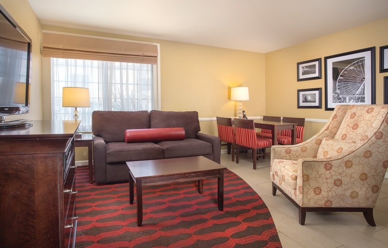All suite hotel within walking distance to Disneyland parks and the Anaheim convention center. On-site shuttle service to and from the parks is available for a nominal fee. This spacious two-bedroom resort suite measures approximately 730 square feet. You'll enjoy a king bed in the master bedroom, two queens in the second bedroom and a queen sleeper sofa in the living room. Additional amenities include a kitchenette, dining area and two bathrooms. Maximum occupancy is eight.