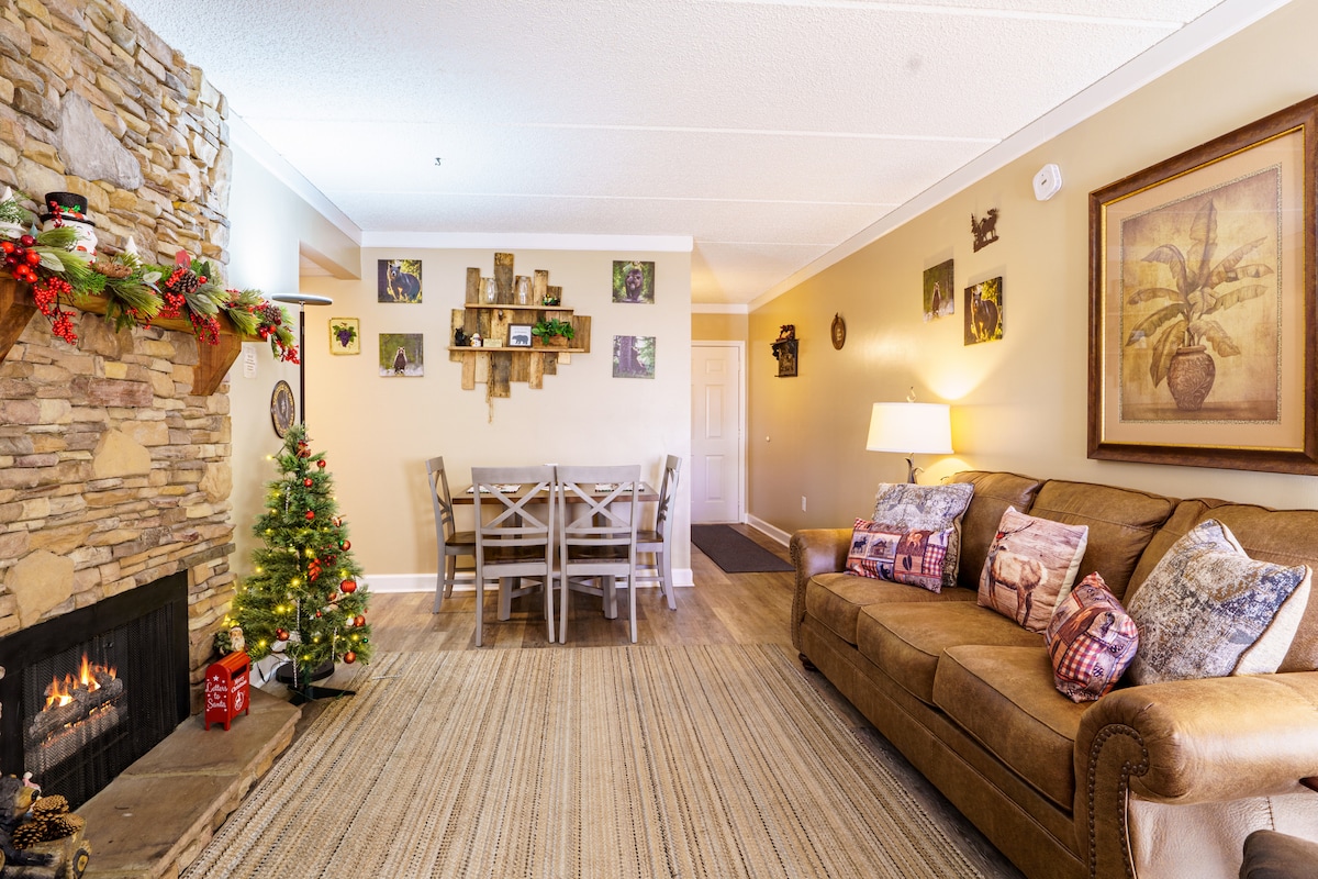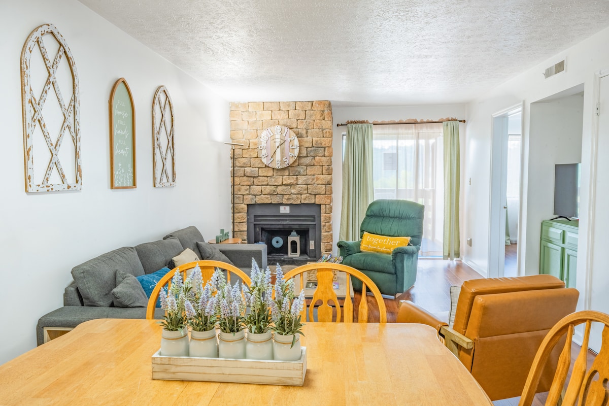舒适的2卧室公寓,靠近城镇!壁炉+泳池通道!