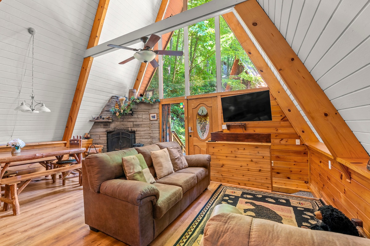 Log Heaven is a pet-friendly cozy log cabin tucked into the trees atop Ski Mountain in Chalet Village, just 1 mile from Ober Mountain and minutes from downtown Gatlinburg. Enjoy a private wooded setting, fireplace, porch with gas grill, and loft game area with pool table. Direct access to Cove Mountain Trail, seasonal clubhouse amenities, and frequent bear sightings make this a true Smoky Mountain retreat. Pet fee applies.