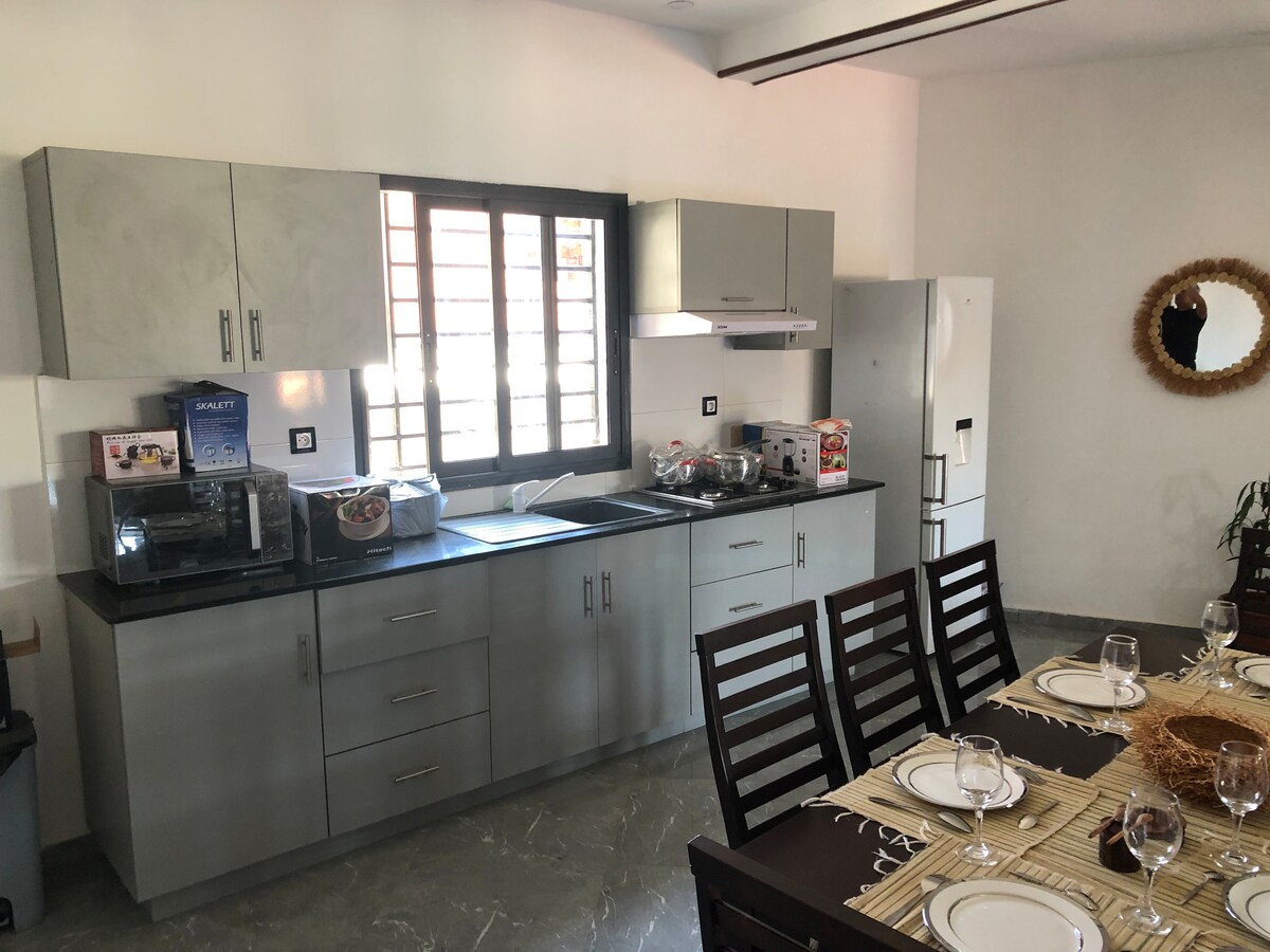 Bienvenue dans votre havre bohème, à 10 minutes de l’aéroport. Cette maison, décorée avec soin, entièrement équipée, avec wifi et canal+, offre une grande cour verdoyante où le chant des oiseaux agrémente chaque journée. Située dans un quartier calme et sécurisé, elle propose des équipements de qualité, un groupe électrogène, un gardien disponible 24h/24 et un service de shuttle pratique entre l’aéroport et la maison à la demande. Un lieu paisible parfait pour se détendre et se ressourcer.