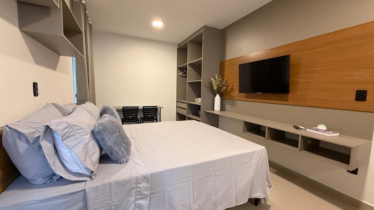 Relaxe em um Estúdio Estiloso e Tranquilo com Comodidades Completas! * Acomodações Confortáveis! * Cozinha Completa! * Conforto e Praticidade - Banheiro privativo, ar-condicionado, mesa de estudo e guarda-roupas com gavetas e cabides * Entretenimento e Conectividade - Wi-Fi com internet de ultra velocidade e smart TV para suas horas de lazer. * Comodidades do Condomínio - Aproveite a praticidade de um mercadinho completo 24h no condomínio!
