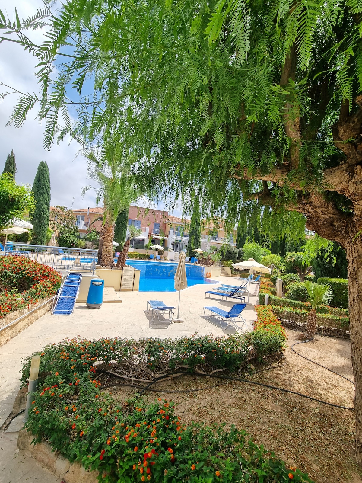 Enjoy your holidays!! It is a very well-kept and quiet holiday complex near Paphos with a large pool area, baby pool and modern facilities. The beach with crystal clear water is only 800 m away. The city of Paphos can be reached by bus (approx. 15 minutes). Other attractions such as Aphrodite Hills are nearby. Ideal for golfers, as there are 3 international golf courses in the immediate vicinity (approx. 10 minutes by car). Near the airport (approx. 15 minutes).