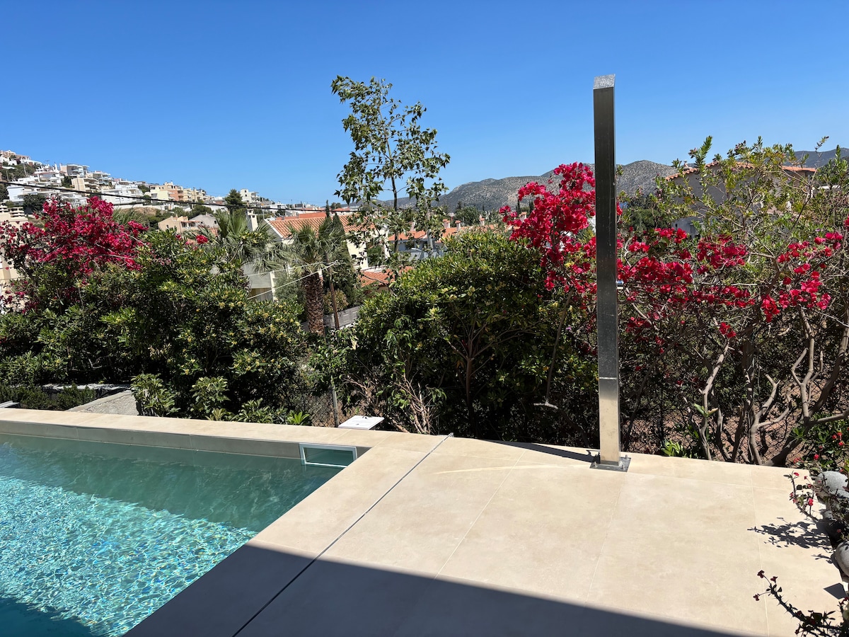 This beautiful house in the seaside resort village of Aghia Marina, located on the Athens Riviera (only 15 min away from the airport) is the single one in a 1,5 acre property. The property, planted with olive trees, and other water self-sufficient plants offers various places for relaxation under the shade.