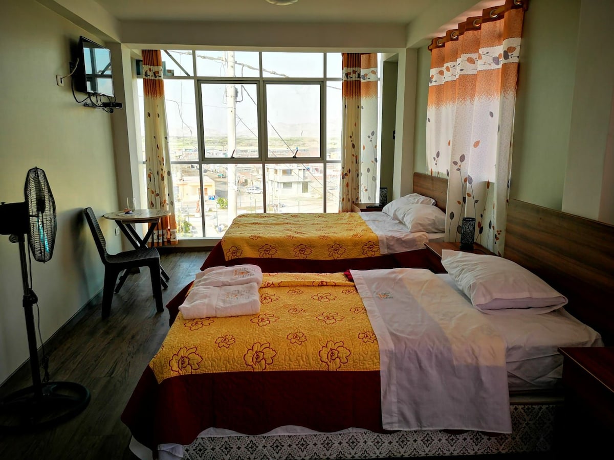 Disfruta de la la comodidad de una amplia habitación . con excelente ubicación (a 12 minutos caminando y 4 minutos en carro de de la Plaza de Armas) ; cálida y acogedora cómoda e iluminada, baño privado con agua caliente las 24 horas , smart tv 35', cable premium, Wi-Fi.. harán muy agradable tu estadía. Te brindamos útiles de aseo y recojo a la estación de bus, vendre a darte la bienvenida y a recibirte con un cálido abrazo