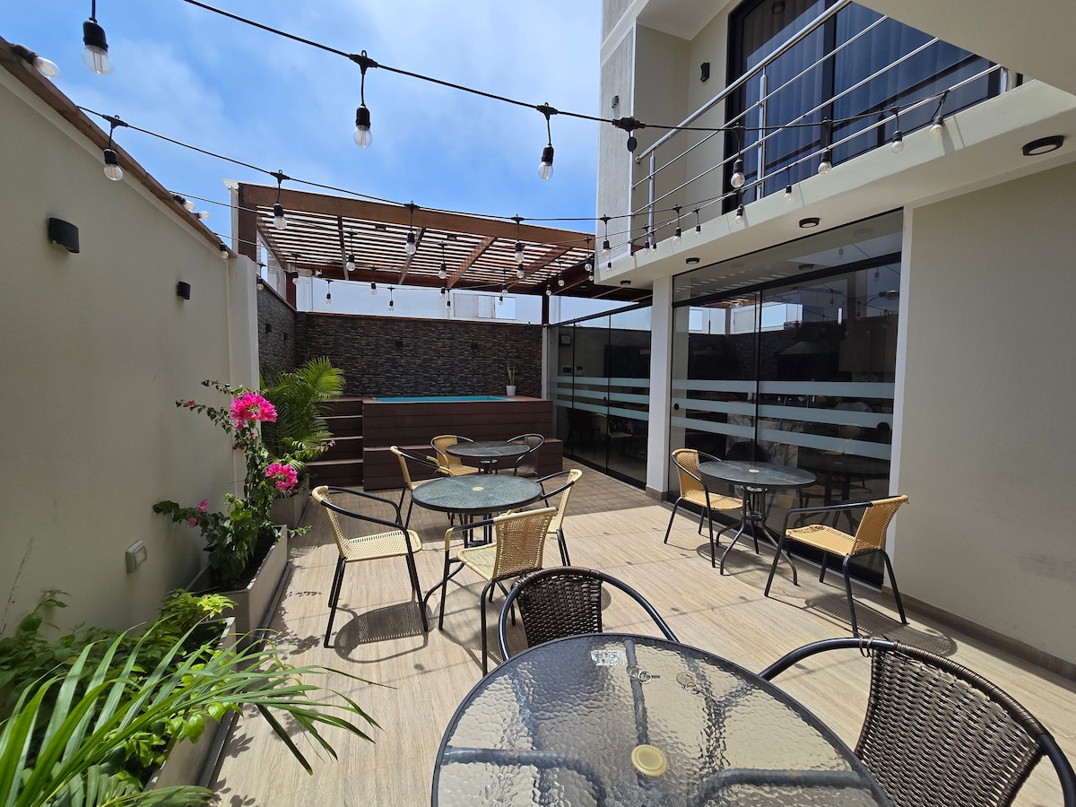 Diviértete con toda la familia en este alojamiento con estilo moderno. Estamos a solo 5min de la plaza de armas de Huaraz. Contamos con espacios equipados , Smart TV , jacuzzi y una hermosa vista hacia los nevados de la ciudad . También contamos con servicio de movilidad.