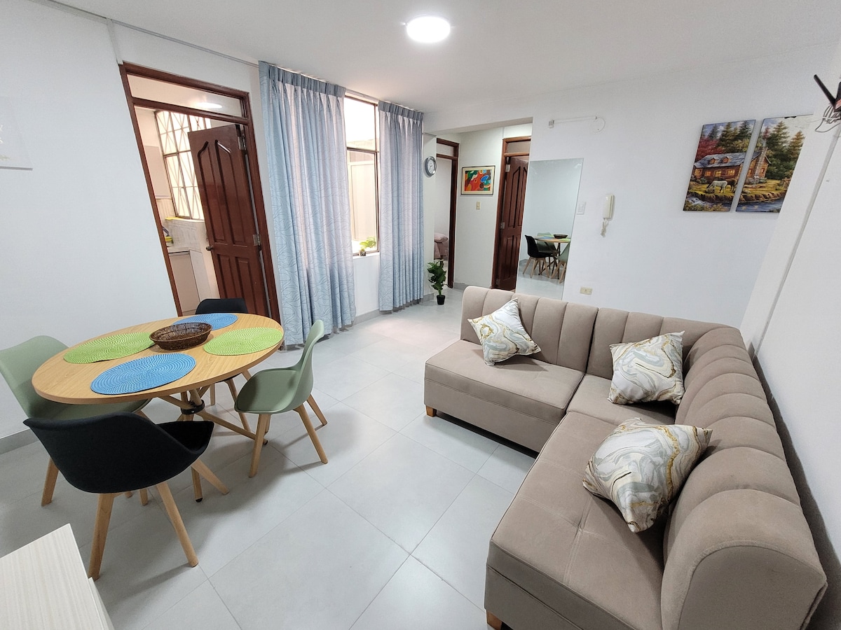 Apartamento ubicado en una zona tranquila de la ciudad de Nuevo Chimbote, a solo 2 cuadras y media del Ovalo la Familia, a minutos de la plaza mayor de la ciudad, tiendas y restaurantes , mercado. A 15 minutos de las playas Vesique, Caleta Colorada, Los Chimus, Tortugas. Relájate con toda la familia en este tranquilo lugar. TV Disney plus.
