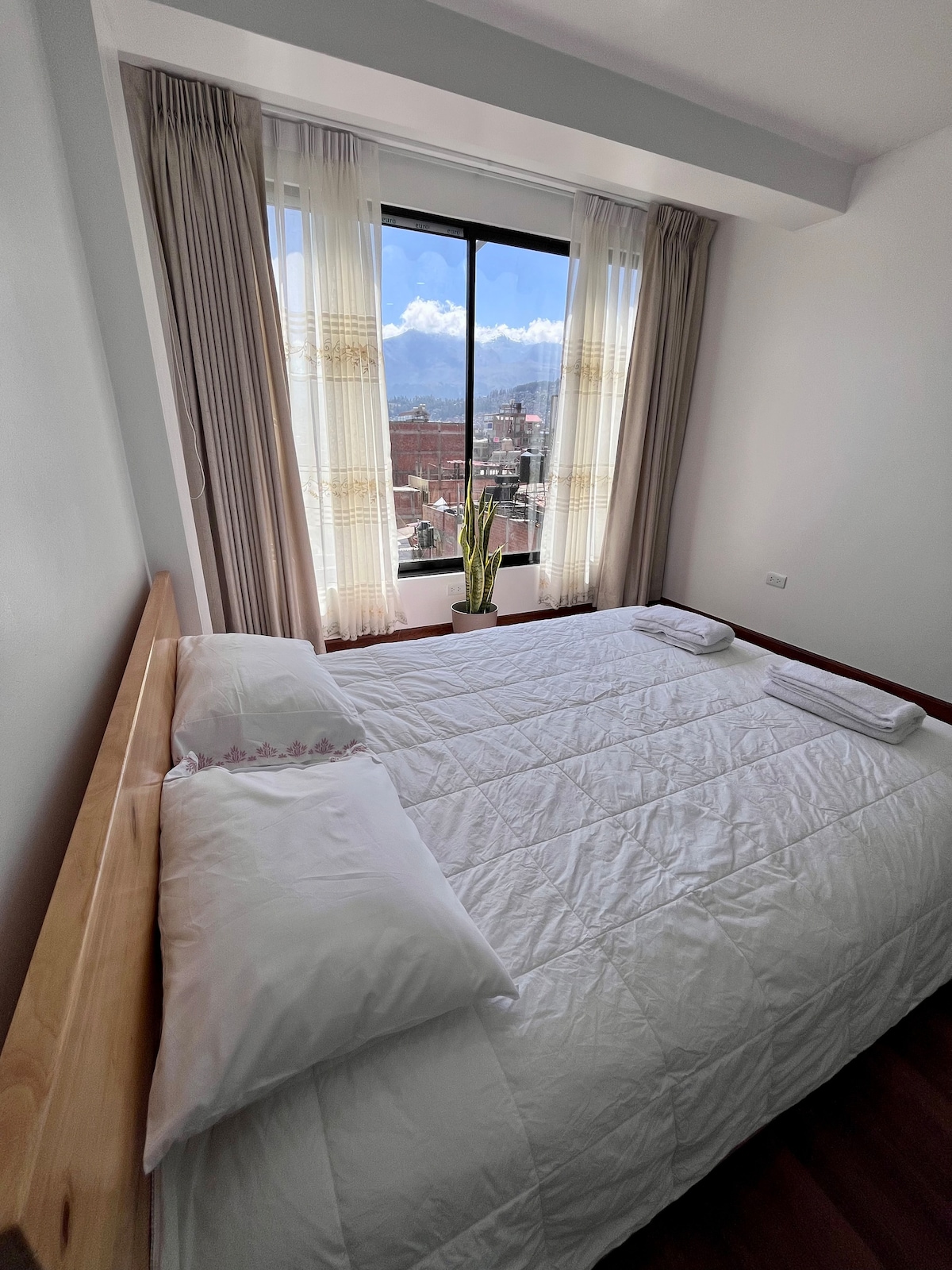 Zona Urbana, piso 6 con terrazas vista nevado, a 5 minutos de la plaza, cama de Queen vestida, baño completo en la hab. con Jacuzzi, c/ toallas, secadora de cabello, plancha para ropa, closet, sala comedor con tv, cable y WIFI, cocina americana equipada a gas natural, con horno, microondas, refrigerador, licuadora, cafetera, hervidor, Copas, menajes, lavadora de 10kg, agua fría/caliente 24 horas, cochera eléctrica dentro del condominio, zona parrilla, pet friendly, check in automático.
