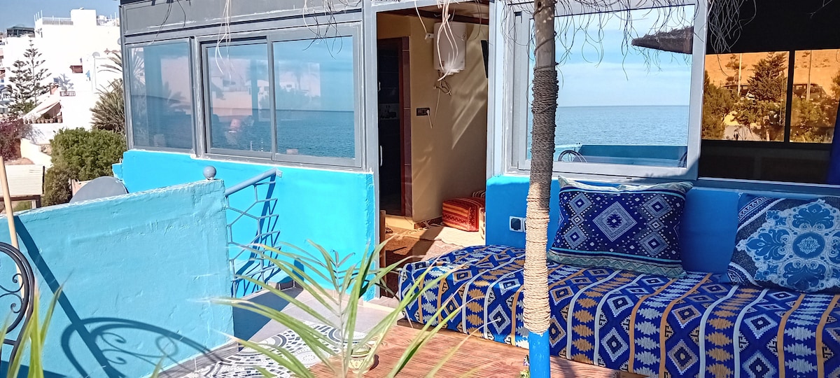 Willkommen, Marhaban, Bienvenue und Welcome! Das im maurischen Stil erbaute Haus liegt am Hang direkt an der Atlantikküste. Im oberen Stockwerk befinden sich 2 Apartments mit Duschbad und Terrassen, im unteren Stockwerk Küche, Schlafzimmer, Bad und Wohnzimmer mit Kamin. Zwei Terrassen mit Garten münden auf den glatten Felsen. Zum hauseigenen Strand sind es nur 3 Gehminuten. Je nach Wellengang kann man auch direkt vorm Haus ins Wasser springen.