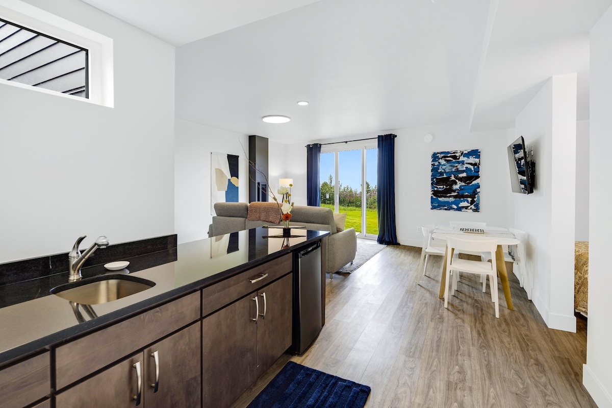 Experience luxury living in this charming basement apartment with a private walk-out garden entrance. It features a fully equipped kitchenette, dining area, and a cozy seating area with a 55" Samsung Smart TV. A king-size bed awaits in the bedroom. The bathroom features a walk-in shower and radiant in-floor heating. The windows have black-out blinds for a restful night's sleep. Enjoy the convenience of an in-unit washer/dryer and the beauty of your private garden. Rich Fir paneling throughout.