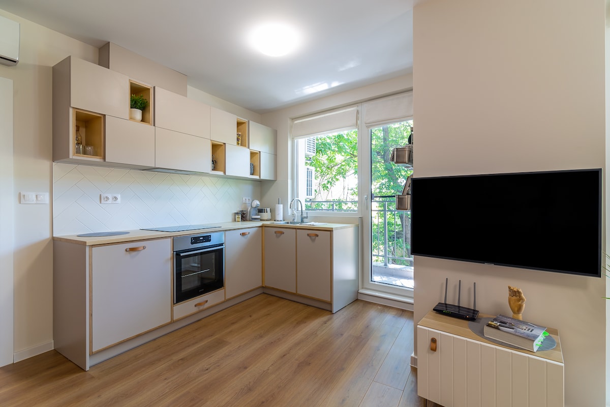 With a completely modern look, our one-bedroom apartment is now ready to welcome you! The elegant interior is carefully chosen to make you feel just like at home. The flat is fully equipped with everything you need either for your short or long-term stay. At your disposal is also a parking spot. Strong Wi-Fi connection is covering the entire property. The space is disinfected according to the Flat Manager Sanitary Standards.