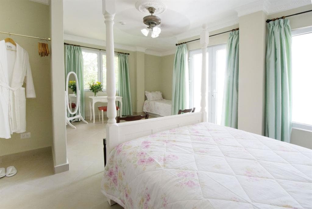 You’ll be charmed by this special room for two. This ground floor room with two ocean and garden view windows offers a pillow top double Bed/Full (137cm x 190cm), 2 bedside lights, free WiFi, a flat-screen smart TV, and a private ensuite bathroom with a shower. Enjoy the shared balcony with ocean, tropical garden or forest view and to a shared hammock area. Additionally enjoy: Plunge Pool -Sun Terrace - Gardens - Nearby ancient forest. Pets in suites only, not this room. Room is air conditioned.