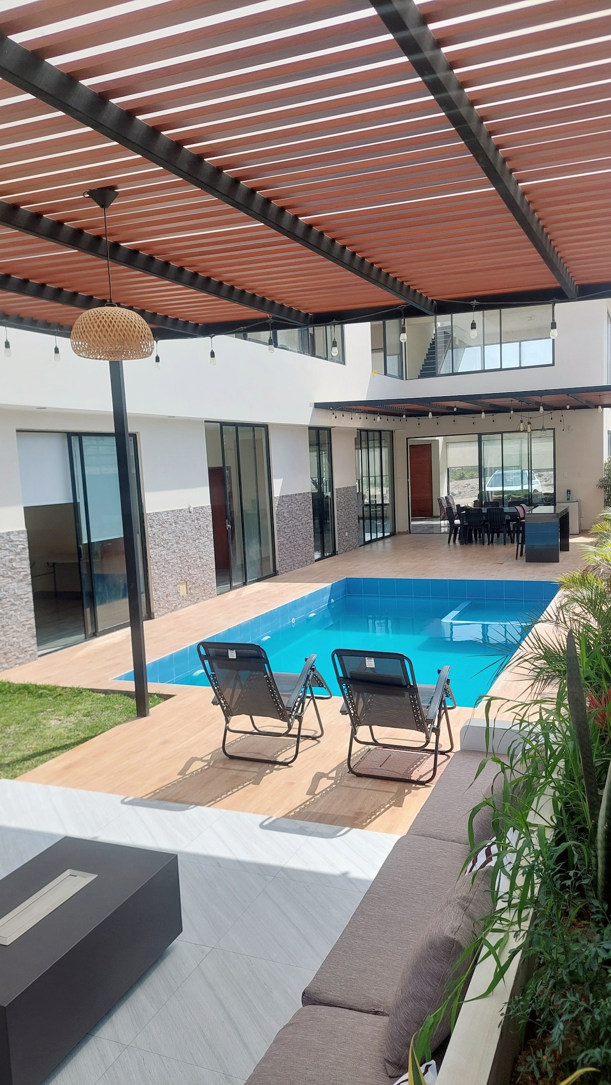 Es una casa de playa recién construida con dos piscinas, para relajarse unos días, cuenta con camas para varios huéspedes. Esta a 2 minutos de la playa así que puedes ir en cualquier momento. Se ubica en un balneario privado, puedes salir a caminar en la noche tranquilamente, la comisaria esta en la entrada del balneario. Cuenta con wifi para conectarse. Puedes reservar el mismo día!! Mínimo 12 huespedes