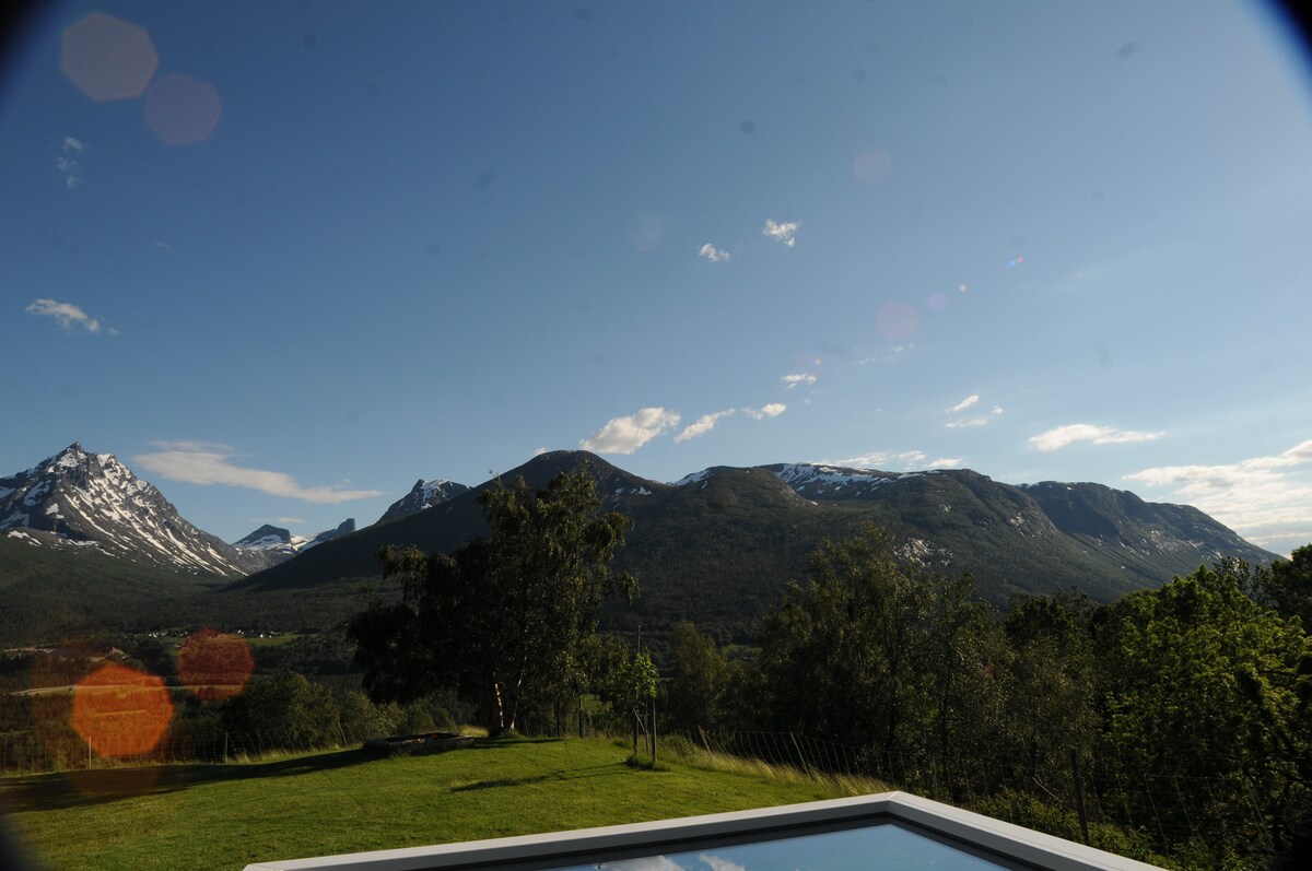 Schønes Ferienhaus mit herrlicher Aussicht auf Fjord und Berge . Das Haus verfuegt ueber eine Fussbodenheizung im Erdgeschoss, grosser Wohnkueche, Bad mit Dusche und Waschmaschine ,Wohnzimmer mit Sat TV, Schlafraum mit 4 Betten und einer Terasse mit Blick auf vorbeifahrende Kreuzfahrtschiffe. Es ist der perfekte Ausgangspunkt , um Norwegens schønste Sehenswuerdigkeiten zu besuchen. Dazu gehøren die Trollstigen , Trollveggen ,Geirangerfjord, Atlantikstrasse,Rosenstadt Molde und Ålesund.