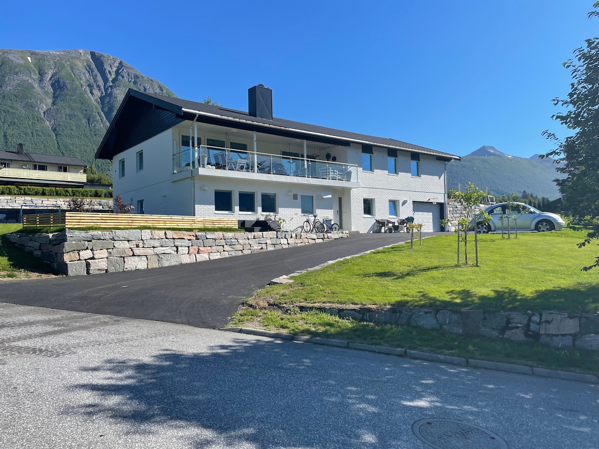 Leilighet med sentral beliggenhet 15 - 20 minutters gange fra togstasjonen. Ligger rett under Rampestreken og Romsdalseggen. Leiligheten ligger i 1. etasje, husvert bor i 2. etasje. Kan være behjelplig med turtips og guiding. Soverom 1: Dobbeltseng. Soverom 2: Dobbeltseng. Denne kan deles til 2 enkeltsenger. Reiseseng med sengetøy til baby kan lånes. Sengene er ferdig oppredd. Håndklær følger med. Fullt utstyrt kjøkken. Har uteplass og parkering.