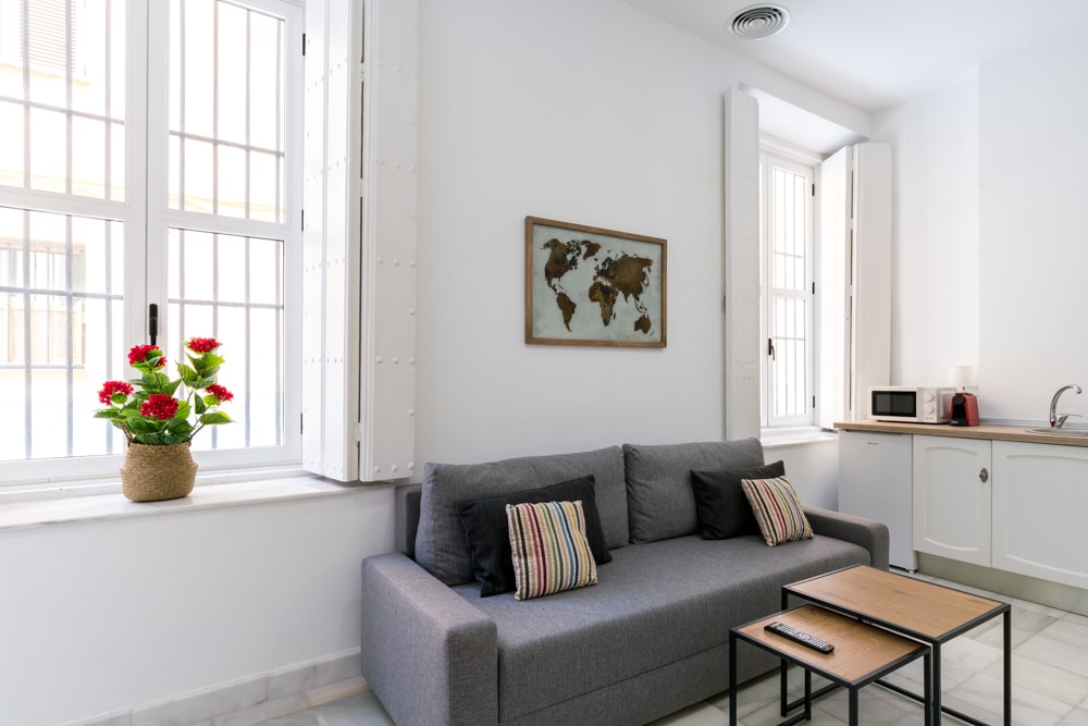 The apartment has: an open plan equipped kitchen, living room with sofa bed and a bedroom with 2 beds. The bathroom has a shower, hairdryer and towels. The capacity of the apartament is 4 persons. The building, completely renovated respecting its original Andalusian style, with elevator and communal terrace with wonderful views of the city. Tourist license: A/SE/00327