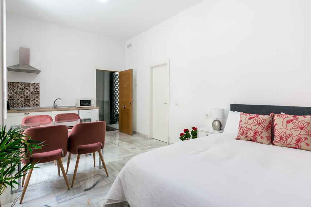 Apartamento tipo estudio en nuestro complejo de Hotel Y Apartamentos Doña Lola. La comodidad de un apartamento, los servicios de un Hotel. Ubicado en pleno centro de Sevilla, en la Calle Amor De Dios, los estudios disponen de cama king size o dos camas, sofá, mesa de comedor, pequeña cocina, Smart TV, aire acondicionado, Wifi y por supuesto baño privado. Disponemos de Terraza Solarium de 200m2 con zona nudista exclusiva y una pequeña piscina para refrescarte. Parking propio de pago.