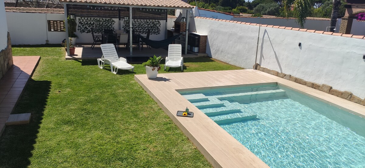 Beautiful villa near the beach in the Roche, Conil (Cadiz) We rent all year round (for fortnights in July and August) and can accommodate up to 8 people. There is WiFi Internet and Netflix Plus, 2 smart TVs, one 70'' screen. The house, 150 m2 (200 including terraces) and 600 m2 of garden, is a typical Andalusian tile construction totally and perfectly equipped and decorated with style, for maximum comfort and enjoyment. It is only 50 meters from the beach. So close that you can go barefoot.